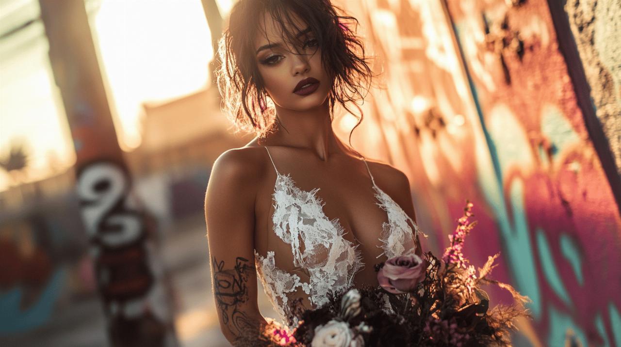 The materials chosen for your dress define its character and impact. Lace remains a timeless option, offering delicate detail that softens the rebellious edge whilst maintaining elegance. Calais lace, renowned for its exquisite craftsmanship, provides a luxurious touch that elevates any design. For brides seeking something more daring, incorporating leather accents or a full leather jacket over a classic bridal silhouette creates an unmistakable rock vibe. This juxtaposition of soft and hard elements captures the essence of modern alternative weddings. Sleeves present another opportunity for creative expression. Long lace sleeves evoke gothic glamour, adding drama and sophistication, whilst sleeveless designs offer a minimalist, contemporary feel. Consider experimenting with colour beyond traditional white; blush tones or bolder hues can transform a dress into a true statement piece. Chic detailing such as studded embellishments, asymmetric cuts, or unexpected collars further personalise your look, ensuring your dress is as unique as your love story.